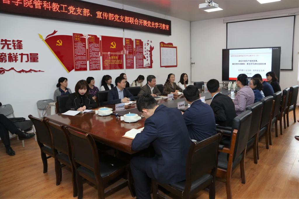 第二阶段,结合“学党史、悟思想、办实事、开新局”的目标要求,以党史学习教育促教书育人。围绕习近平总书记在学校思想政治理论课教师座谈会上重要讲话精神,管科教工党支部和党委宣传部党支部以“讲好中国共产党的故事,做有情怀的教师:我为学生讲好思政故事”为主题开展研讨交流。管科教工党支部四位党员曹丽、吕美、王育晓、李刚和教师代表唐可分别围绕best365网页承担的5门校级和院级公开课的课程思政建设进行了发言。
