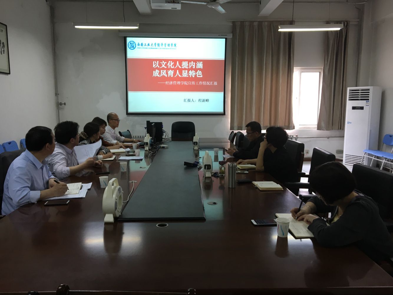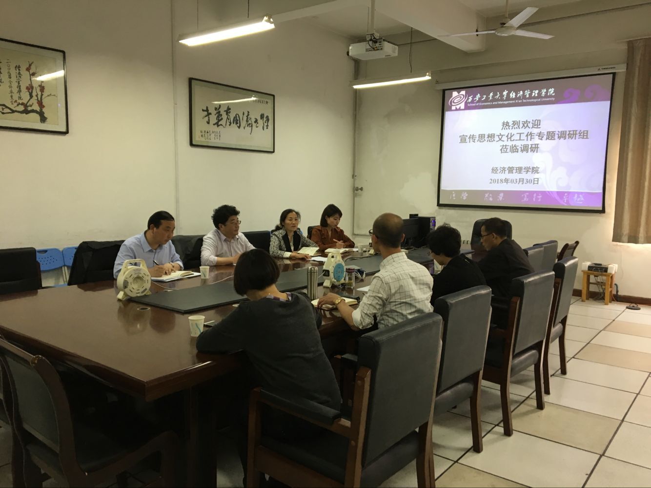 首先由学院汇报相应情况。主管宣传的程副书记汇报了学院宣传工作,汇报以“以文化人提内涵 成风育人现特色”为题,介绍了学院的宣传工作目标、工作思路、工作情况,并分析主要存在问题、提出建议。曹书记按调研提纲所列内容,逐项进行了汇报并介绍了学院今年宣传工作的重点。张院长就党的十九大精神与学院学术、科研和教学工作的融合情况进行汇报,并对学校挖掘和推广先进典型人物的甄选提出建议。