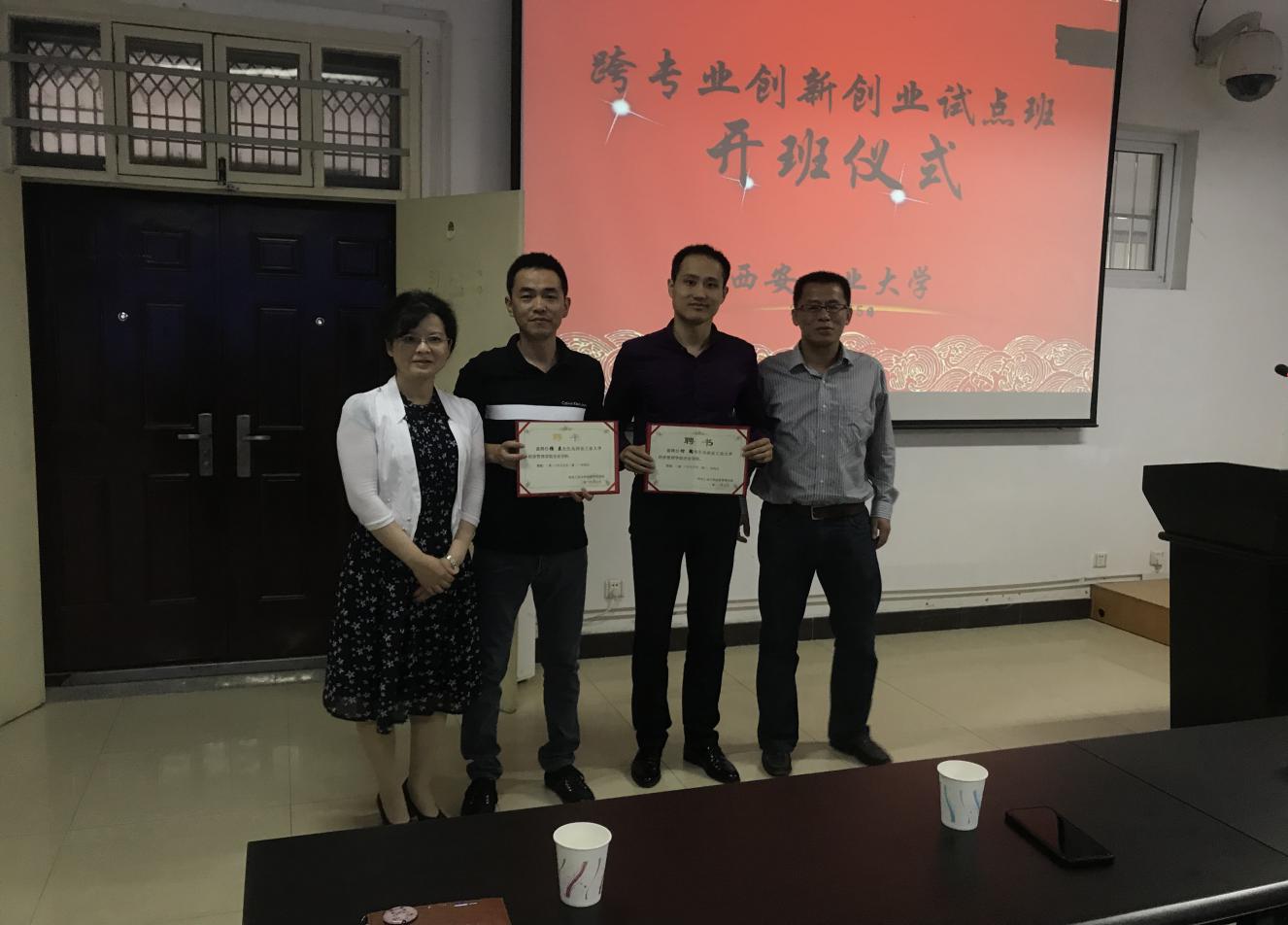 最后,齐华处长和张弘院长分别向杨力老师和付陶老师颁发企业导师聘书。“跨专业创新创业试点班”全体学生40人参加了仪式。