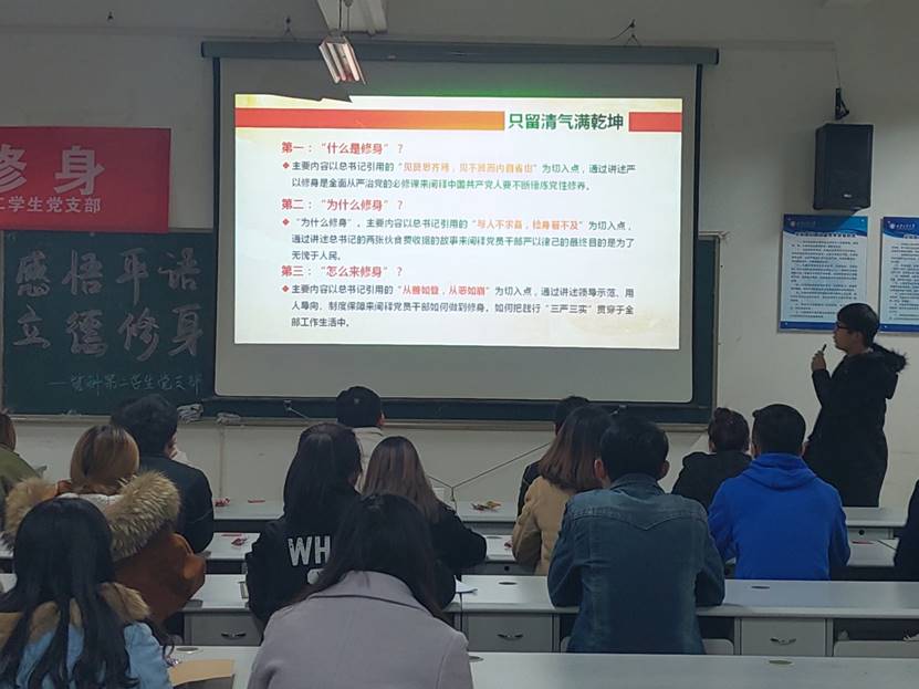 为了让大学生更好地将传统文化的华章佳句和新时代思想联系起来,重温习近平总书记重要讲话,强化学生党员们的政治意识,best365网页版登录管科第二学生党支部于2018年11月22日下午在教5-506举办了《感悟平语 立德修身——平“语”近人文化品鉴》活动,支部书记侯剑波老师及37名支部成员参加了此次活动。