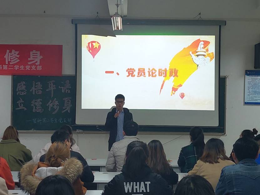 本次学习活动由17级研究生桑志强主持。活动分为党员论时政、“平”语入人心、问答忆传统、视频悟典故、学习交流传经典五个环节。首先,通过学生党员对时政热点的讲解与个人看法的阐述,使大家树立起学无止境的大学生学习观;紧接着,学生党员运用PPT为大家讲解经典用语及典故,中华传统文化直入人心,让同学们对在生活中运用典故有更深次的理解;随后,全体学生党员观看了《国之本在家》影片,学习习近平总书记对家风的有关思想,深切感受总书记所说“天下之本在国,国之本在家”的文化精髓;活动最后,老师和学生党员们互相分享交流,将中华文化与个人学习相联系,践行平“语”文化,传承经典的同时增强文化自信。