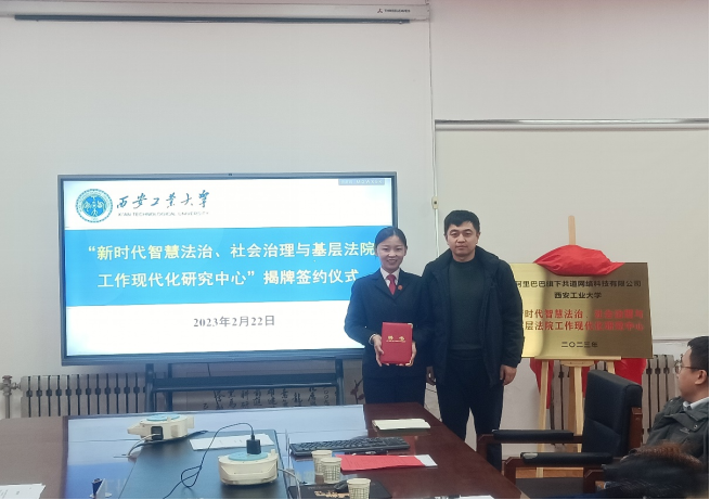 2月22日中午,best365网页版登录与西安未央区人民法院,西安丝路物联网产业园管理有限公司(倪光南院士专家工作站),阿里巴巴旗下共道网络科技有限公司合作签约,暨新时代智慧法治,社会治理与基层法院工作现代化研究中心揭牌仪式在best365网页版登录教5-520会议室举行。未央区人民法院未央宫人民法庭庭长郭丽华;共道网络科技有限公司副总裁刘业轮,总监王晨昊;丝路物联网产业园管理有限公司倪光南院士专家工作站发展合作部主任毛真;best365网页版登录院长苏兵,党委书记姬浩,党委副书记王育晓,副院长焦源出席了揭牌签约仪式。