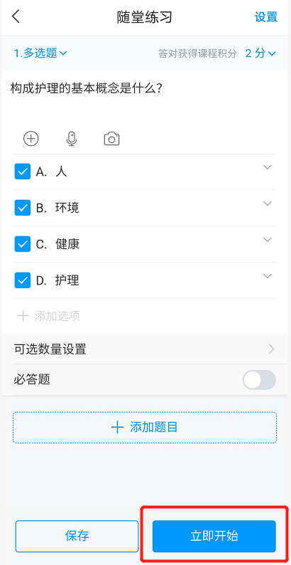 课堂上,当老师需要发起互动时,点开之前设置好的课堂活动,点击“立即开始”,此时活动任务就发送到学生端,学生点开消息即可参与。