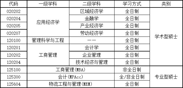 学院现有管理科学与工程、工商管理和应用经济学3个一级学科硕士点授权点,工商管理硕士(MBA)、会计专业硕士(MPAcc)和物流工程与管理(MEM)3个专业硕士学位授予点。