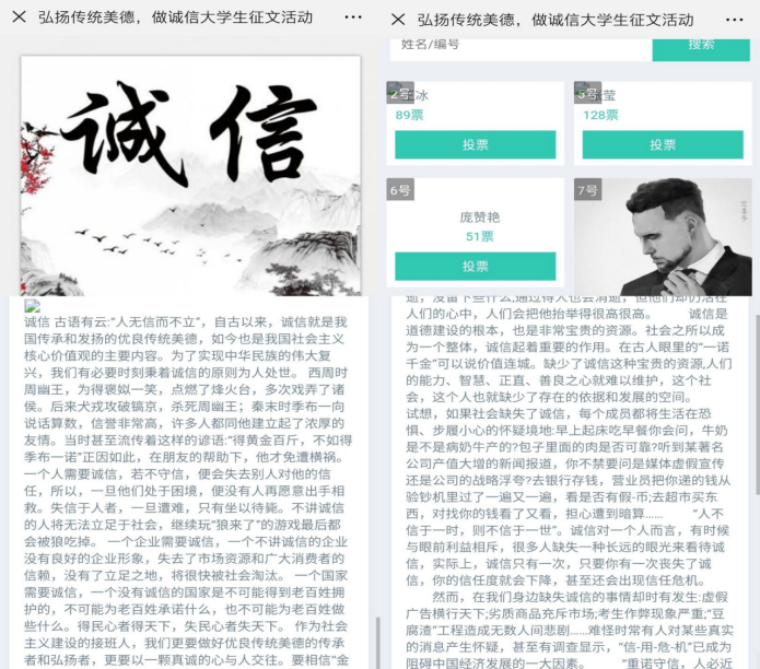 此次主题教育活动分为三个部分,第一个环节是5月25日社团在经纬广场摆摊,通过让全校学生在横幅上签字来达到宣传的目的。其次是5月27日发布网上征文比赛,经过前期的准备和拉票,最终评选出三名得票最高的同学,以达到进一步宣传教育的目的,最后于6月4号,在教2——204举办诚信演讲比赛,通过选手们现场激烈角逐,层层选拔,最终从严格的评分制度中涌现出六位表现优异的同学,网上征文比赛和演讲比赛共同进行颁奖。