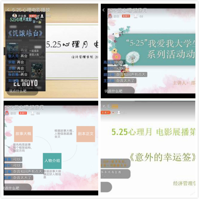 本次系列活动共分为两个部分,第一部分为五月期间每周五晚的“心随影动,净愈心灵”--心理类影视赏析,在此期间两位老师与一千多名同学们共同欣赏了四部精彩绝伦的电影佳作,并在观影时积极探讨交流,帮助同学们疏导不良情绪,缓解压力,获得心灵成长;第二部分为5月12日到23日举办的“寻找藏在心底里的幸福”--心理剧剧本征集,在老师们的悉心指导、各班同学的思维碰撞下,活动期间共收集到来自18级18份、19级29份的心理剧剧本,旨在通过剧本创作引导同学们去思考感情、提升自我,以此来促进同学们从更高的层次上去反观自己的生活,提升自身心理健康水平。