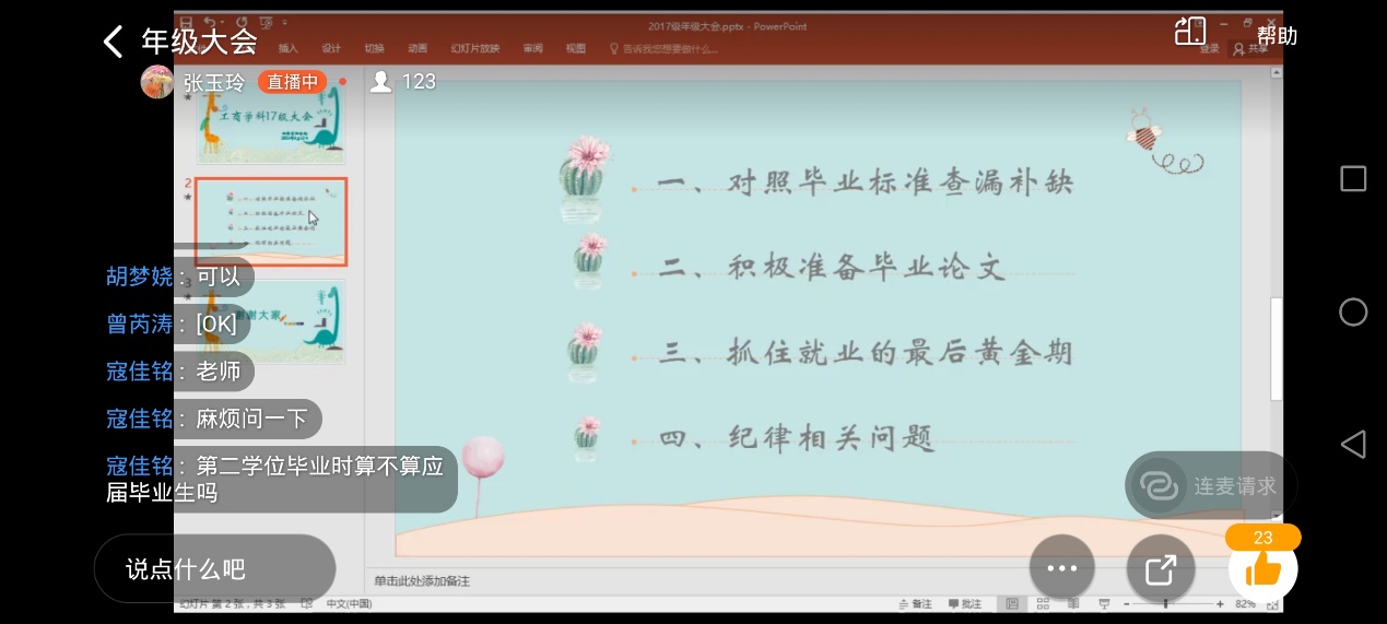 会上张老师首先讲述了第二学位的相关事宜。针对修读双学位的学生现状,引导学生厘清个人具体情况,及早做好个人安排,避免错失良机。然后,张老师针对17级学生重点讲述了毕业和就业的相关事项。第一,张老师强调对于毕业有问题的同学应认真核实、及时沟通、如期补修、不要影响毕业。第二,提醒同学们积极准备毕业论文,毕业班同学要积极与指导老师沟通论文情况,高度重视,认真对待。第三,提醒还没就业的同学抓住最后的就业黄金期,张老师提出三月中旬要把握就业机遇,保底签约,珍惜机会,并对目前本专业学生签约情况进行了分析。最后,张老师强调了纪律相关问题,提醒同学们在校外实习要做好疫情防护工作,留校生也要注意用电安全等问题,并祝愿各位同学毕业顺利。